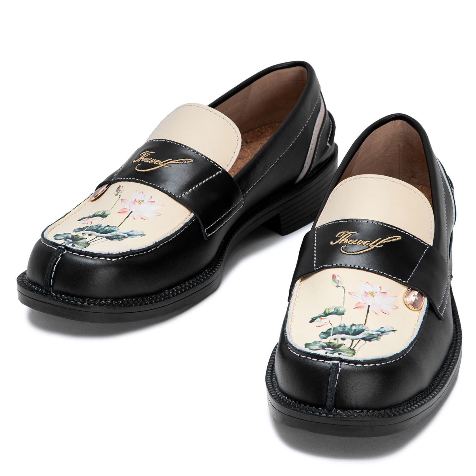 - Chất liệu da: Da bò (Hoạ tiết bông sen được in trên thân giày).